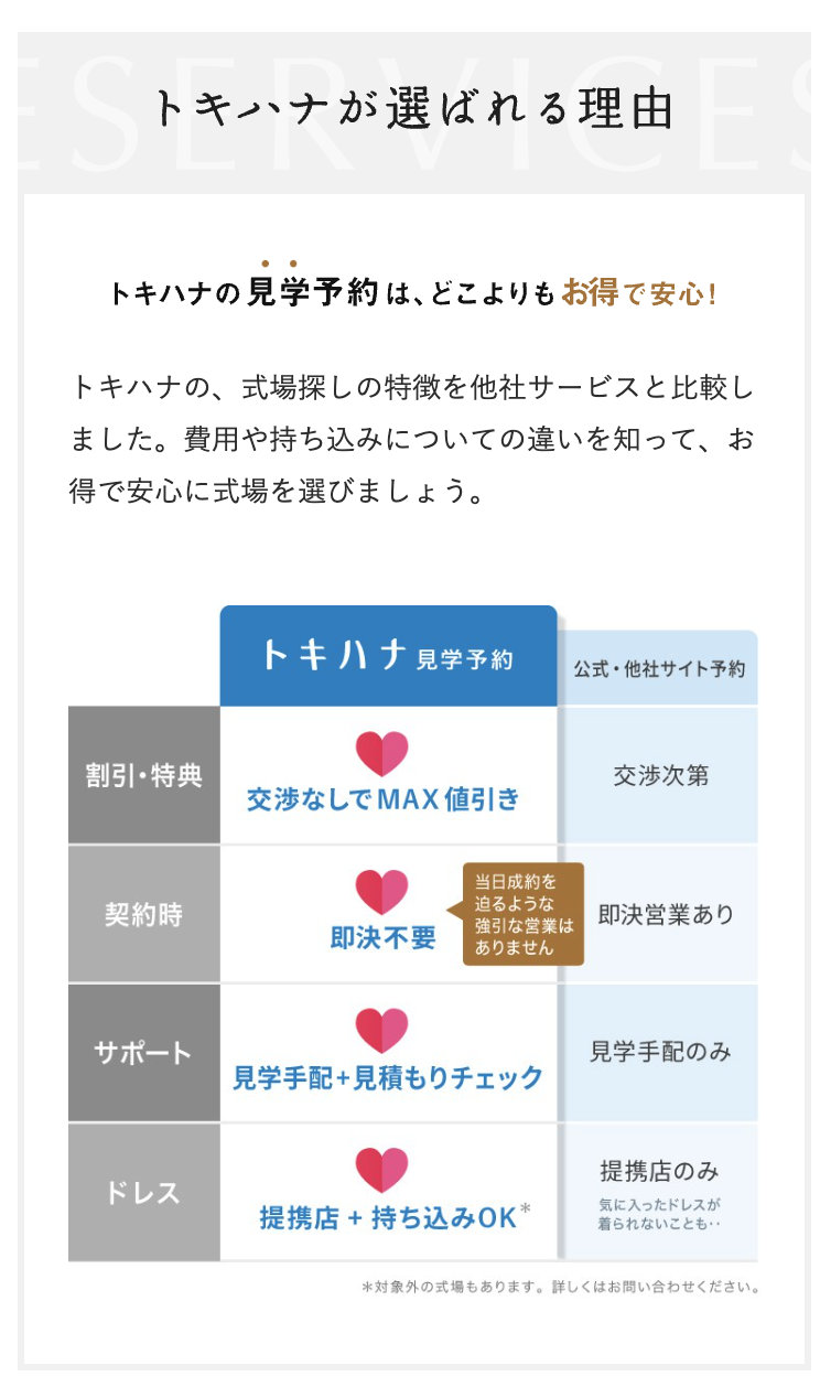 「トキハナ」の特徴 最低価格保証が即決の必要なく適用 見積もり診断&チェック(無料) 持ち込み自由の式場数No,1 ベストな条件で見学(見学のみでもOK) 通常持ち込みNGの式場もトキハナ限定で無料でOKになる(一部式場を除く) 厳選された式場 LINEで多様な診断が揃っている \Webから見学予約可能/ 公式サイトはこちら 公式サイト:https://tokihana.net/ 公式サイトはこちら
