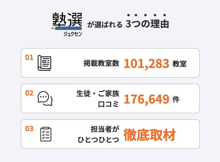「塾選」を利用すれば、学年や特徴・地域などから全国の塾を絞り込みができ、塾の口コミや合格者のインタビューを見ることができます。
