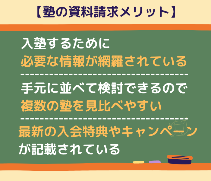 資料請求や体験申し込みは無料でできるので、気になる塾は資料を取り寄せて是非比較してみてください。