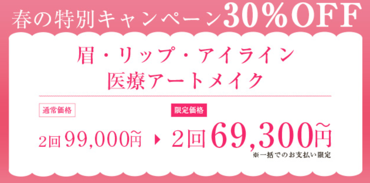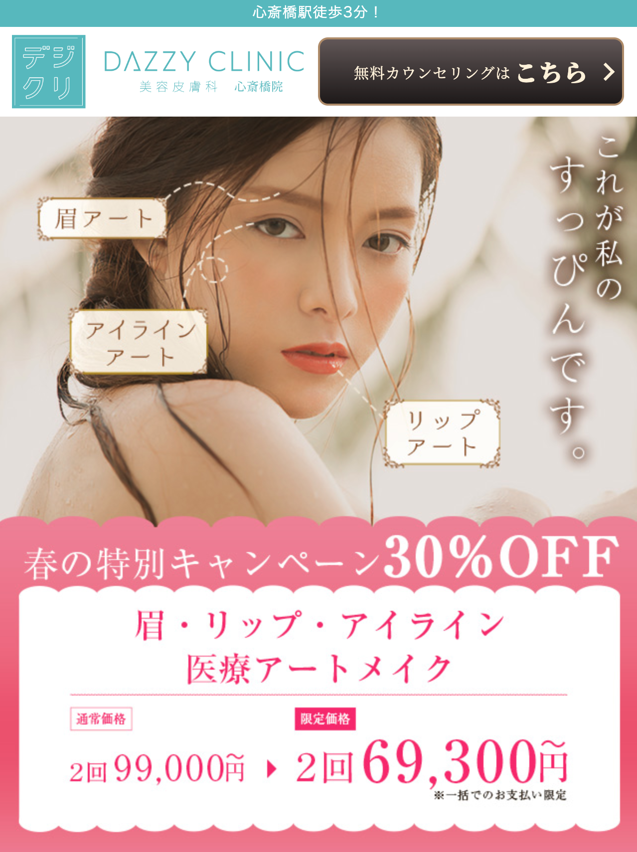 一方、デイジークリニック大阪院は「春の特別キャンペーン」として眉毛アートメイクが2回99,000円~が2回69,300円~と30%オフになっています。