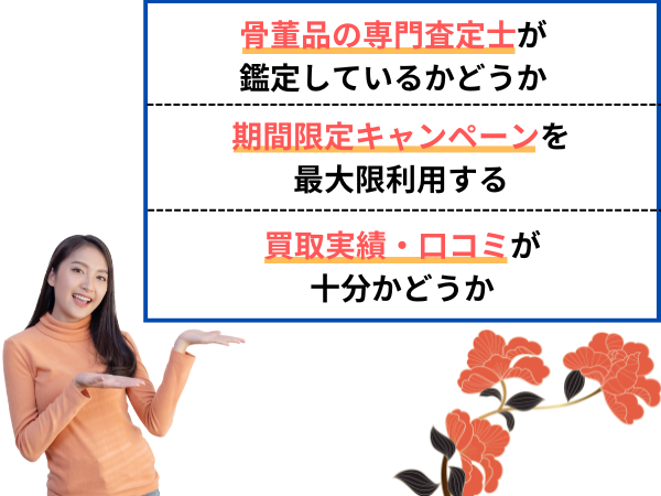 骨董品を高く売りたい場合は、必ず専門の査定士が在籍している業者を選ぶようにしましょう。