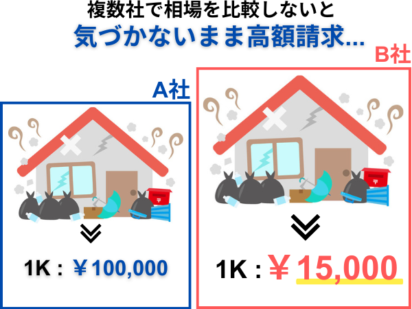 1社だけに依頼してしまうと、費用の相場や見積もり内容が適切かどうかがわからず高額請求される場合があります。