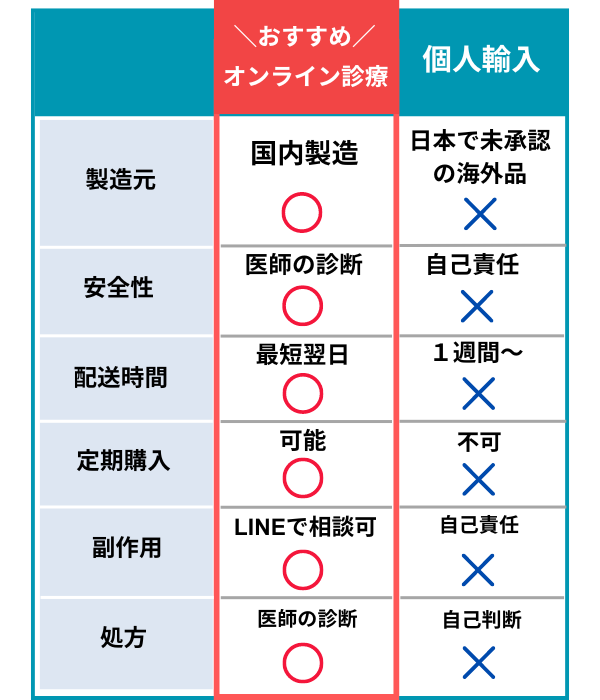 価格や安全性もオンライン診療が優れているため、個人輸入を利用するメリットはないでしょう。