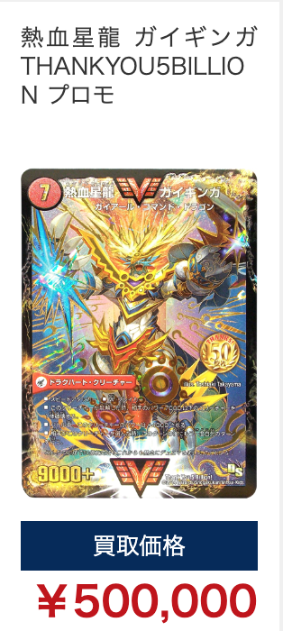 例として「熱血星龍 ガイギンガ THANKYOU5BILLION プロモ」は50万円で買い取りしています。(2024年7月時点)