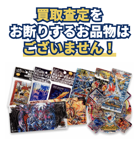 | 買取対象アイテム | ・カード ・未開封パック ・スリーブ ・プレイマット ・デッキケース など |