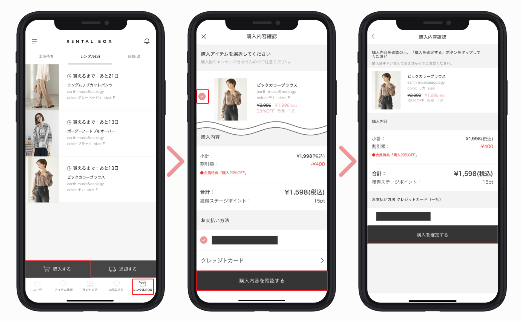 他のファッションサブスクでは買取の手続きが別途必要になりますが、メチャカリでは60日間借り続けるだけで自動であなたのものになります。