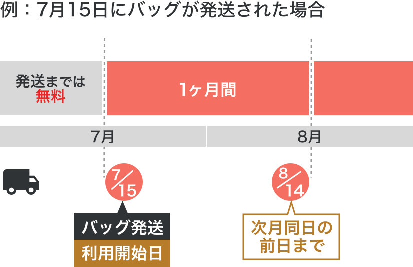 | 返却期限 | 返却期限無し お気に入りのバッグをずっと借りても、違うバッグに交換してもOK |