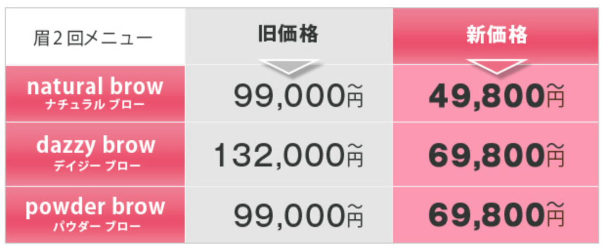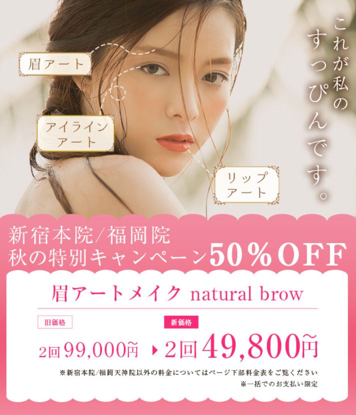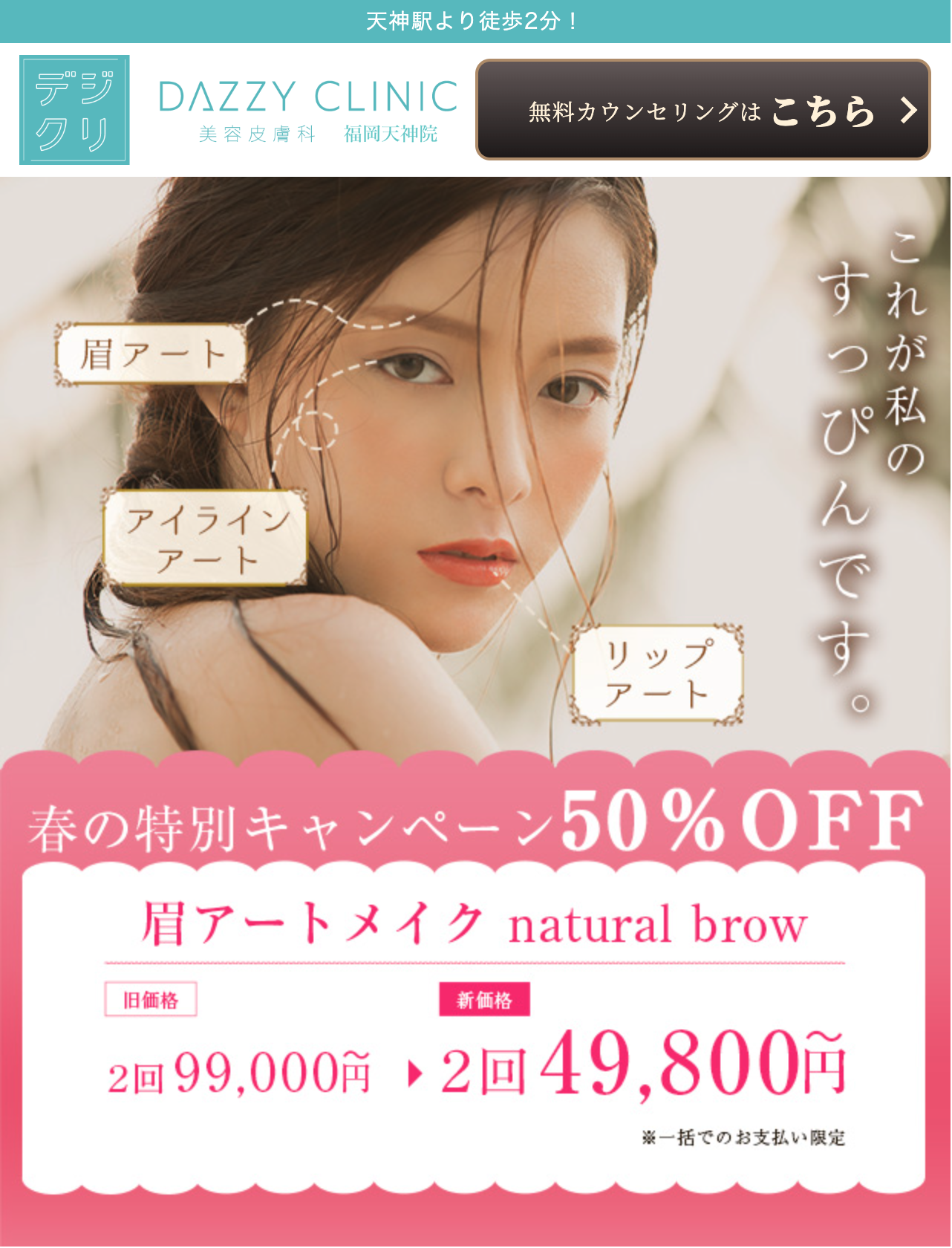 一方、デイジークリニック福岡院は「春の特別キャンペーン」として眉毛アートメイクが2回99,000円~が2回49,800円~と50%オフになっています。