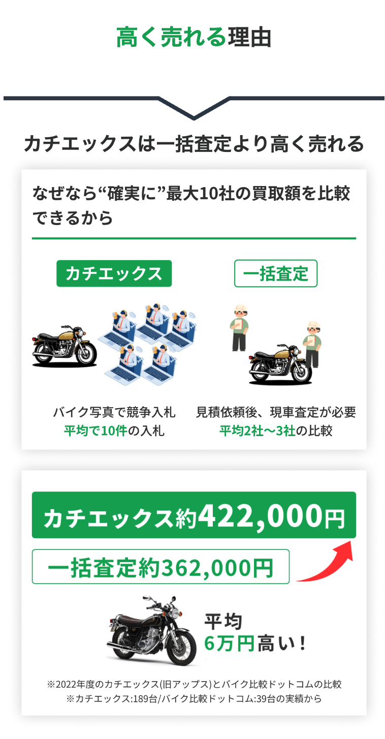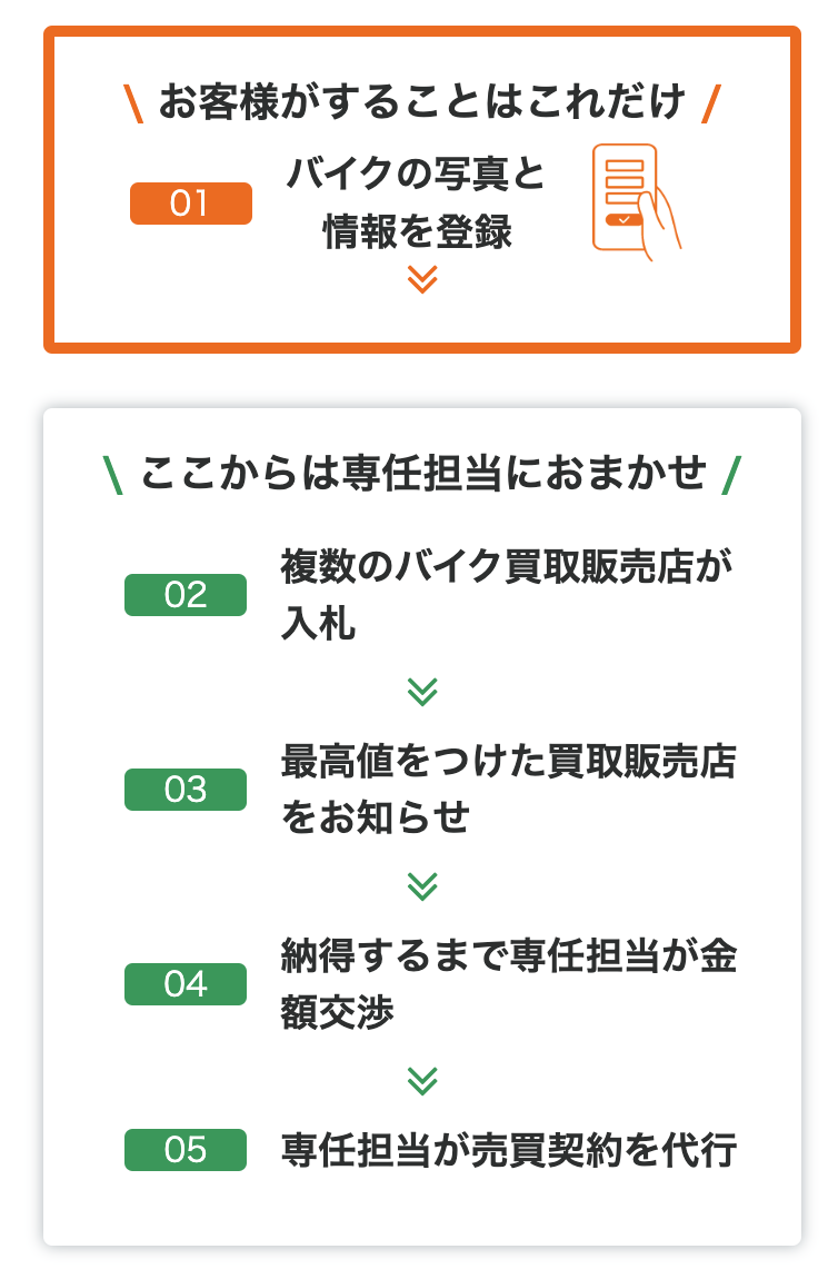 バイクの情報と写真6枚を登録するだけで全国のバイク業者から一斉に入札が届きます。
